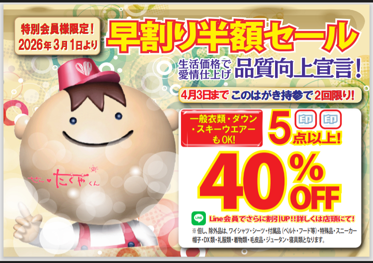 3月のセールのご案内!!! 3月よりしみ抜き&汗抜き加工がなんと!無料!!! (詳しくは店頭でお尋ねください。) さらに!今日から店頭にて!5点以上40%OFFクーポン配布中! 3月15日まで!お渡し中!詳しくは店頭にて! 2026年3月1日 投稿先 未分類 ← 過去の投稿へ