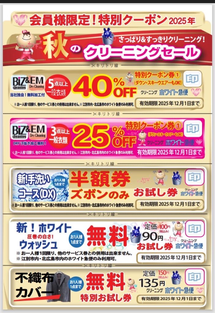 秋の特別クーポン券! 店頭にて配布中!(10月24日より) 詳細は当店スタッフまでお気軽にお尋ねください。配布期間:2025年11月16日まで数に限りがございますので、お早めにご来店ください。皆様のお越しを心よりお待ちしております。 2025年10月24日 投稿先 未分類 ← 過去の投稿へ